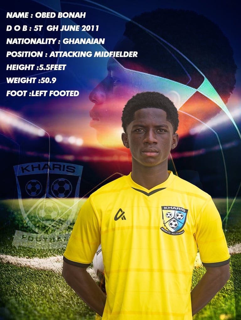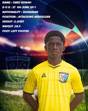 Ghanaian soccer player Abraham Owusu Boateng's Kharis Football Academy profile card.